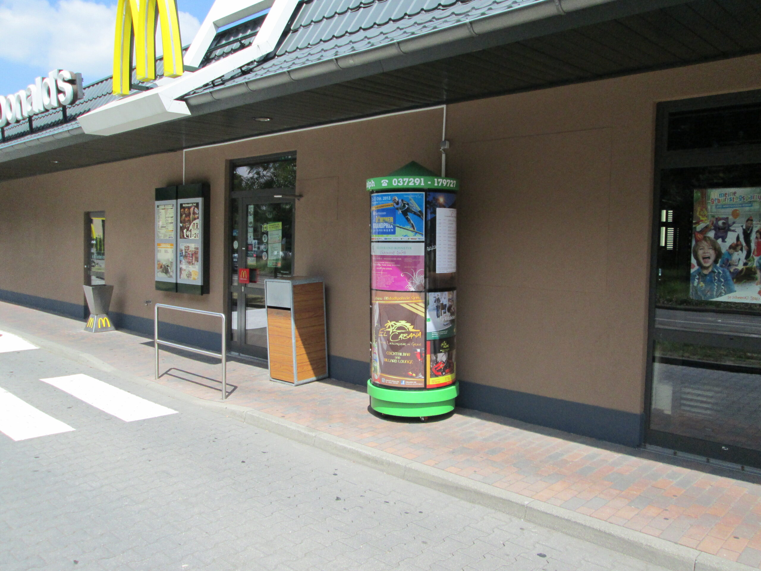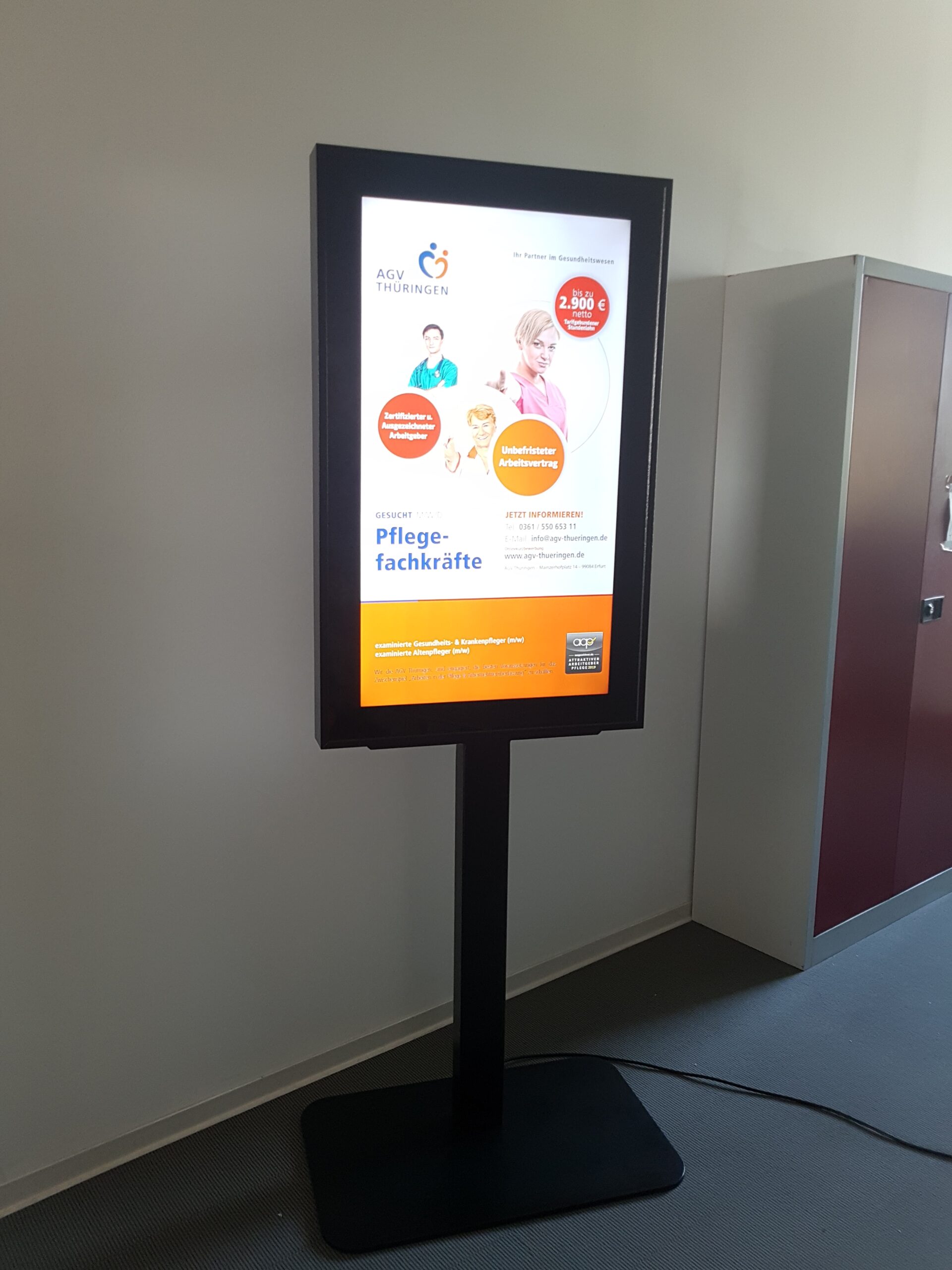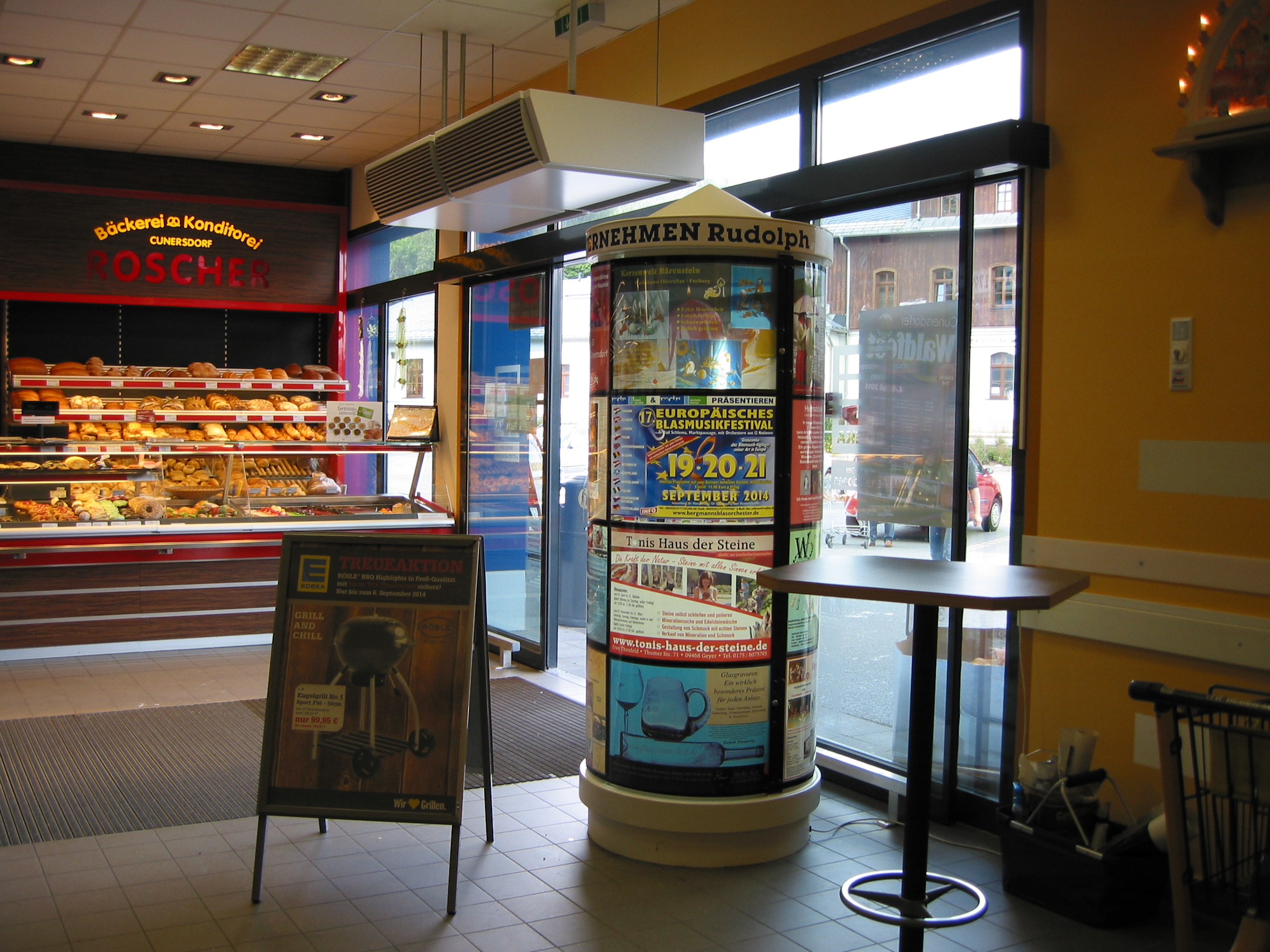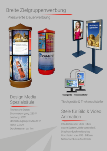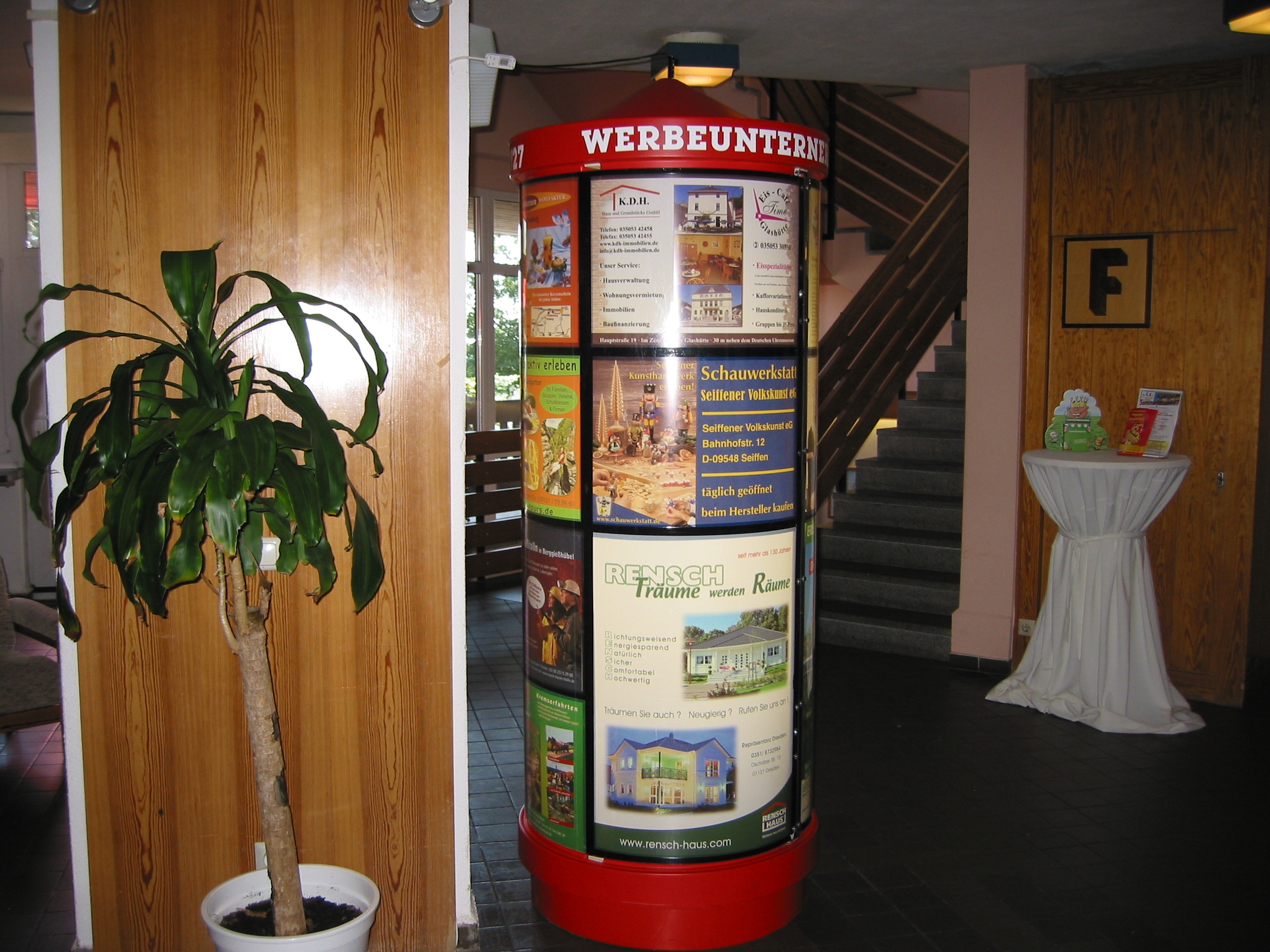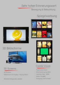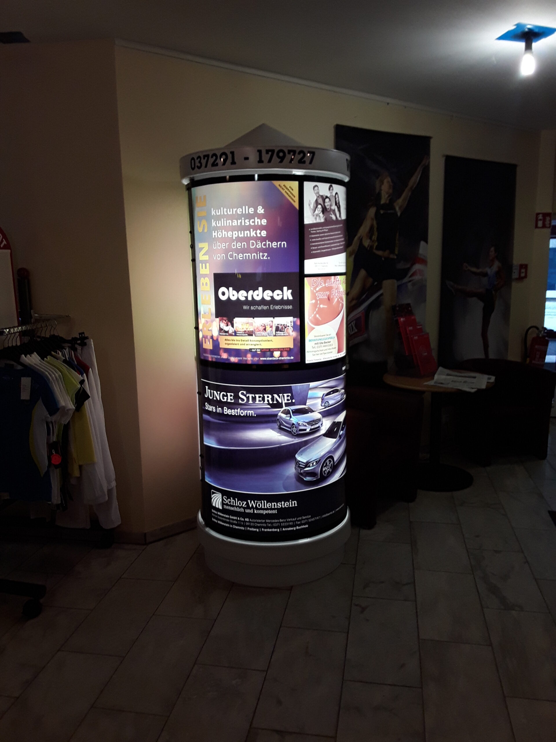 Beleuchtung und Bewegung lenken die Blicke der Kunden auf Ihre Werbeaussage. Die sich drehende und von innen beleuchtete Säule und die Spiegel mit Ihren ständig wechselnden Motiven sind ein perfekter Blickfang, der Ihre Werbung im besten Licht präsentiert.