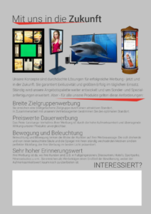 Unsere Konzepte sind durchdachte Lösungen für erfolgreiche Werbung - jetzt und in der Zukunft. Sie garantiert Exklusivität und größten Erfolg im täglichen Einsatz. Ständig wird unsere Angebotspalette weiter entwickelt und um Sonder- und Spezialanfertigungen erweitert. Aber - für alle unsere Produkte gelten diese Anforderungen: